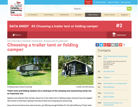 Membership has its perks and the website offers lots of publishing about advice, finance and Insurance deals. Beyond static publishing via excellent responsive web design templating there are other online transactions like a What's On directory where members can also add their own events. For the discerning camper there is a library of technical help that is searchable with PDF datasheet downloads for those that still want to print.